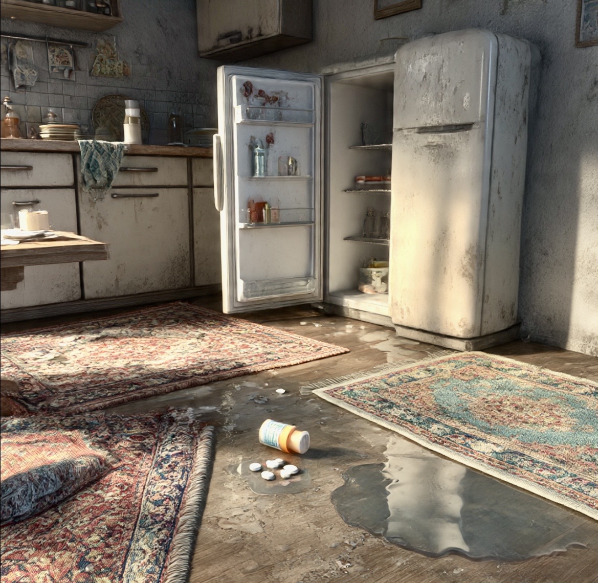 Unwashed dishes, mold, or insect infestations indicating prolonged neglect.